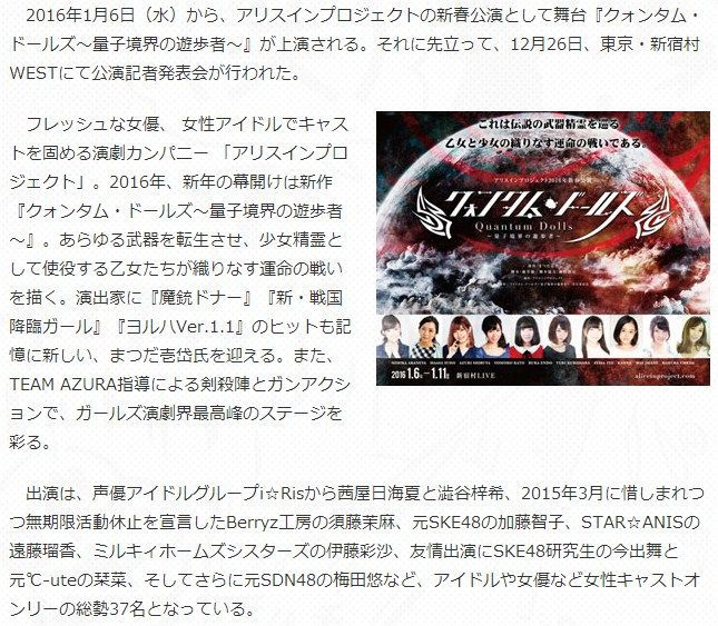 2015年12月31日 おたぽる - i☆RisにBerryz工房など注目キャスト目白押し!女性オンリーの舞台『クォンタム・ドールズ』 http://otapol.jp/2015/12/post-5190.html